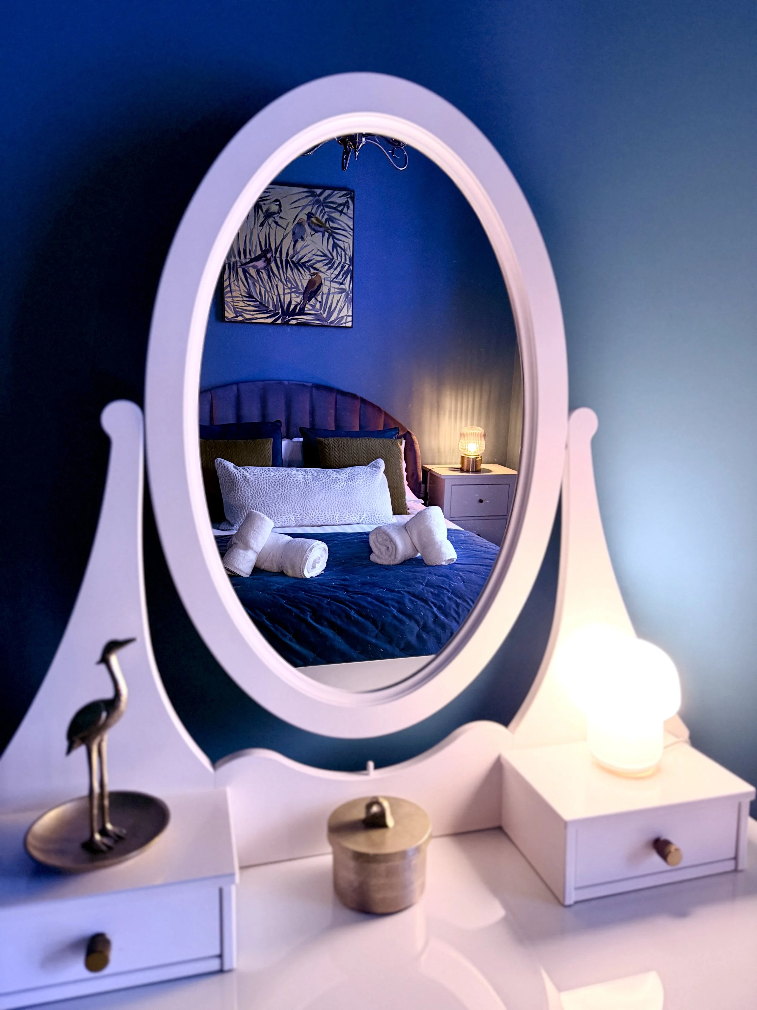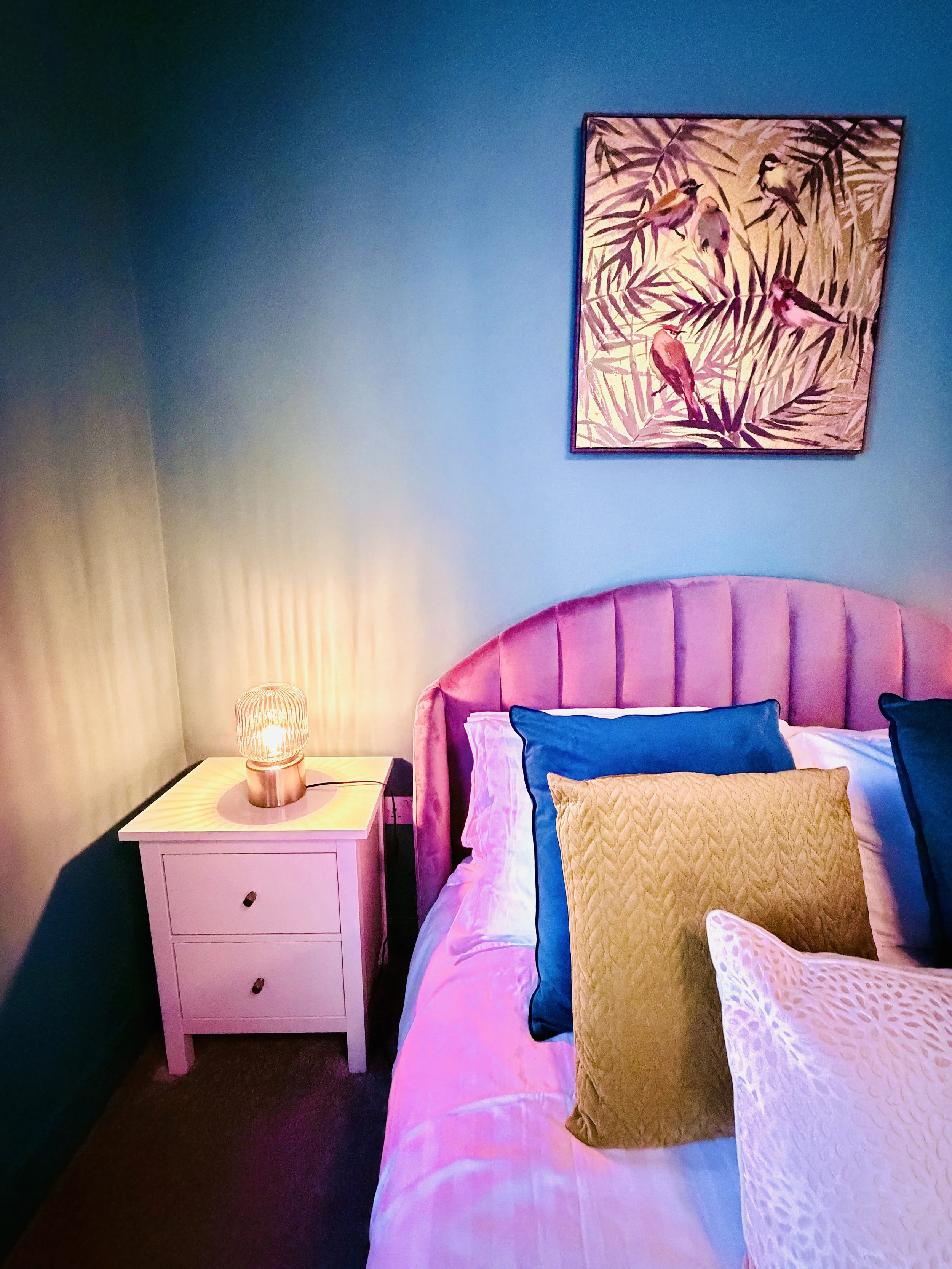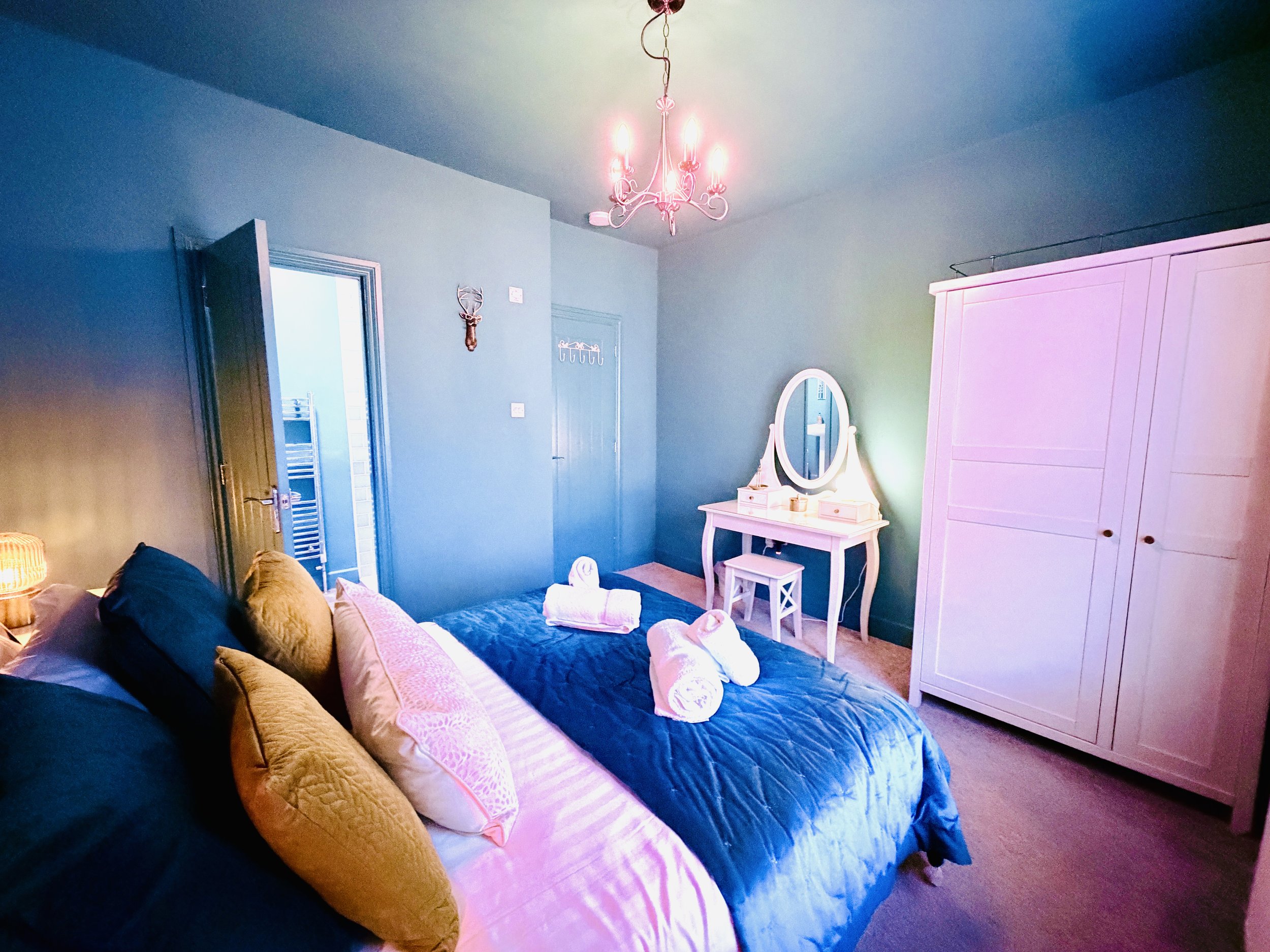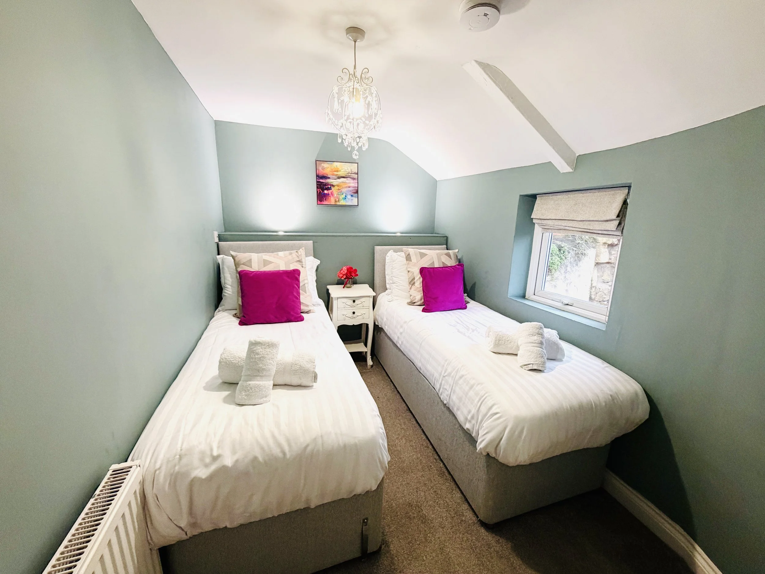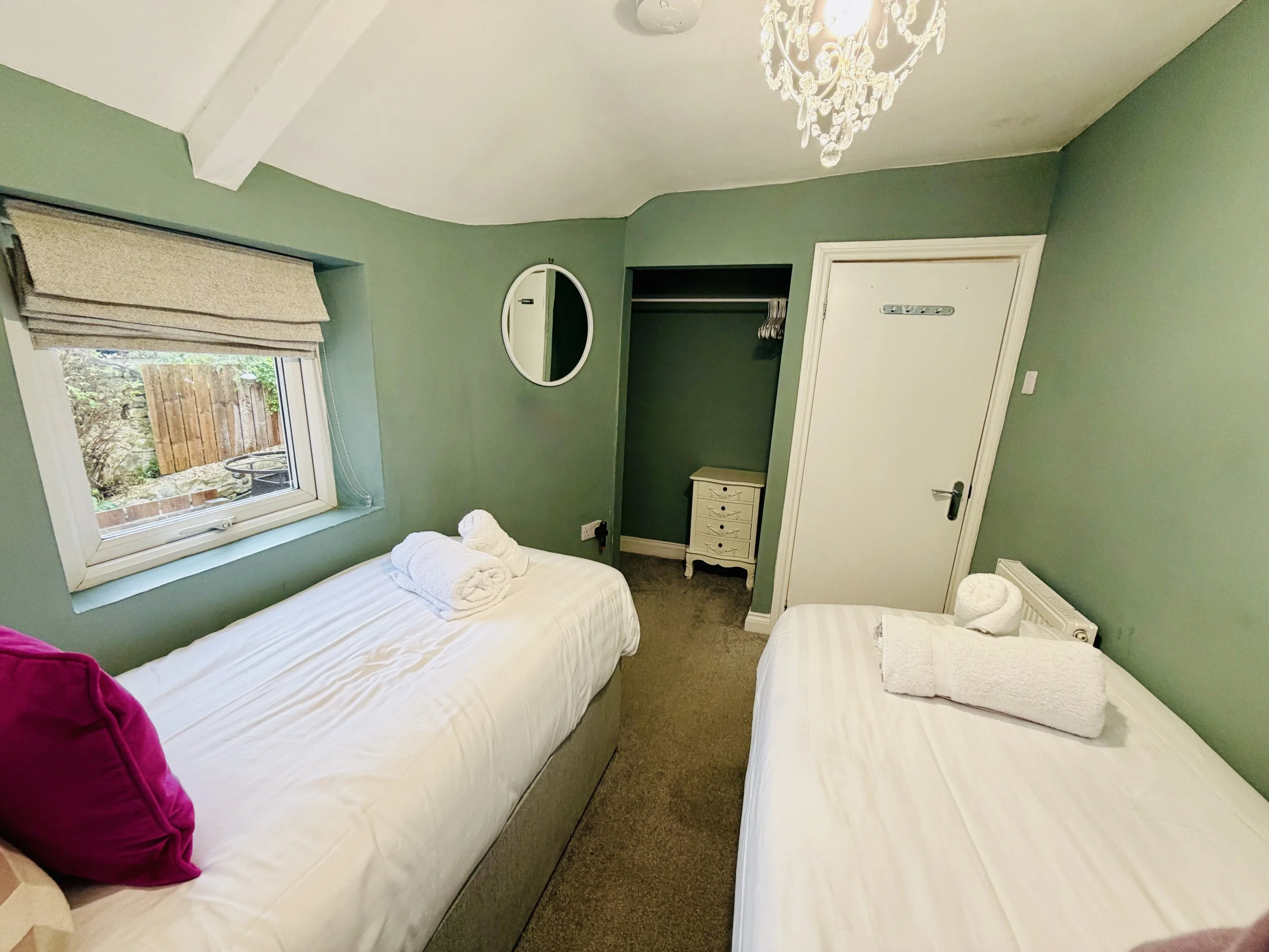 Room 3: Contains 2 Single beds, which can be converted into a Kingsize on request; features an internal wardrobe, bedside cabinet, extra drawers, and a mirror. This room includes uplight spotlights for reading.