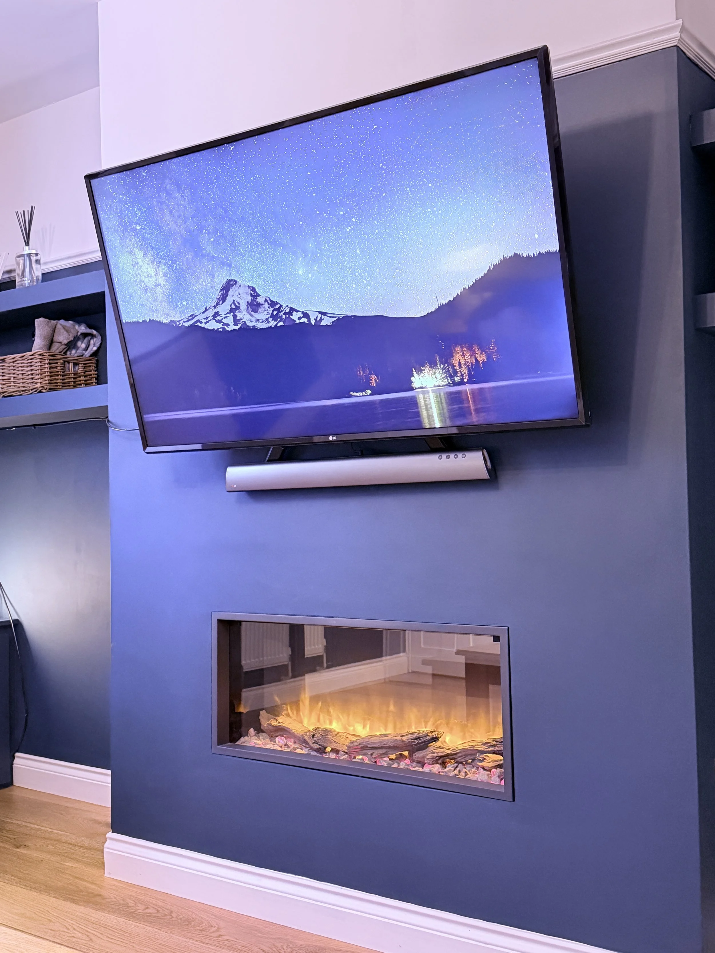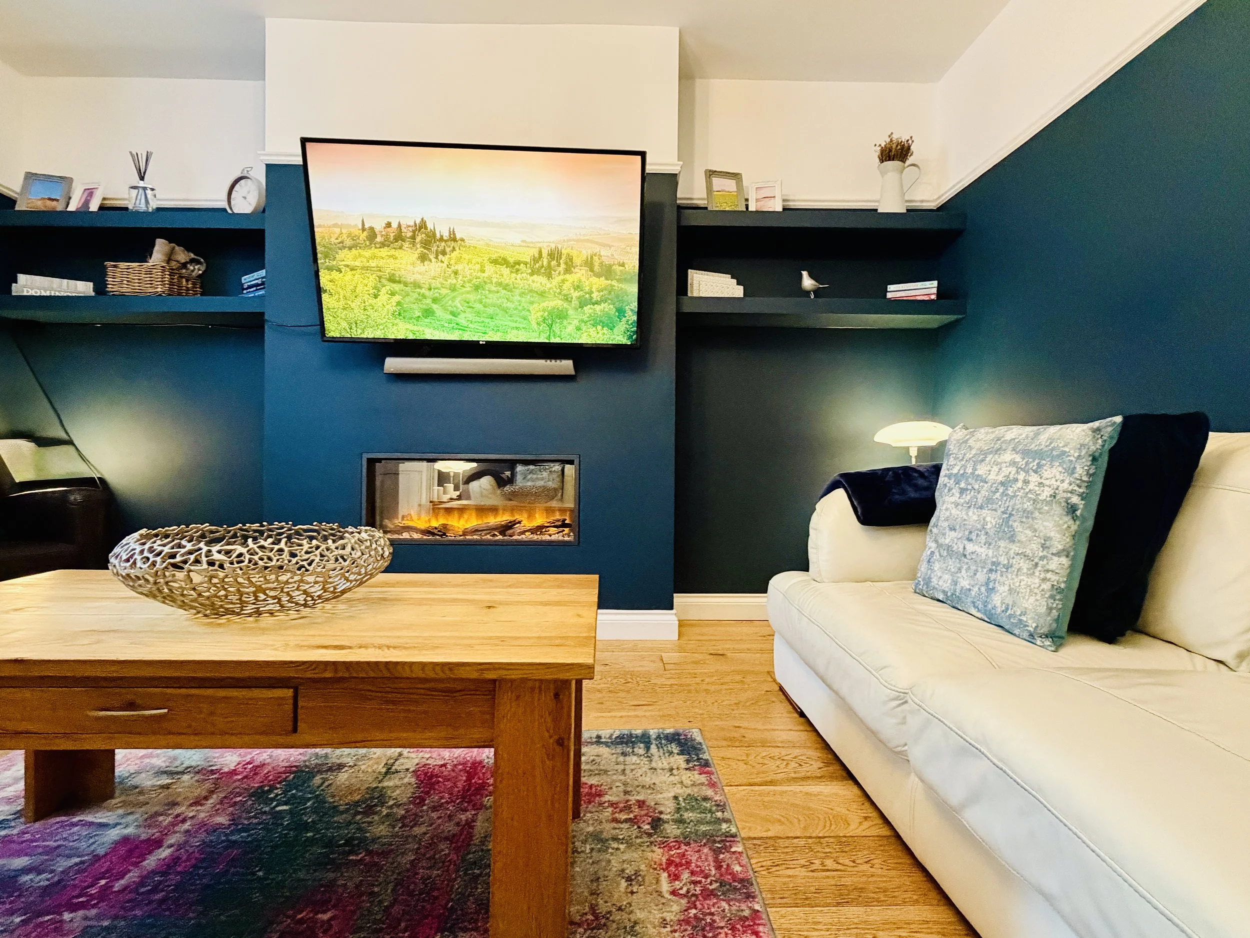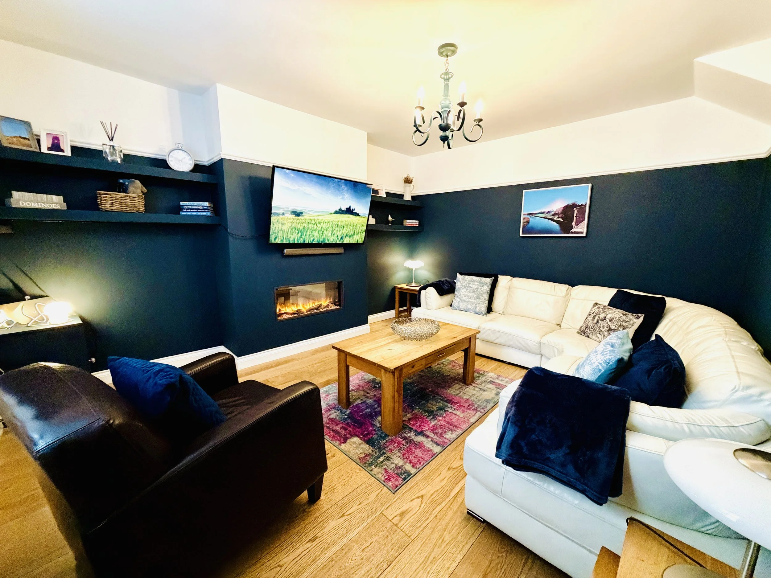 The living room area is exquisitely designed with a welcoming feature fire, perfect for cozy evenings. It includes a coffee table, side tables, and stylish table lamps, all complemented by a Smart TV equipped with a subwoofer and sound bar. The seating arrangement boasts a spacious L-shaped leather sofa accommodating six, alongside an additional leather chair for extra comfort.