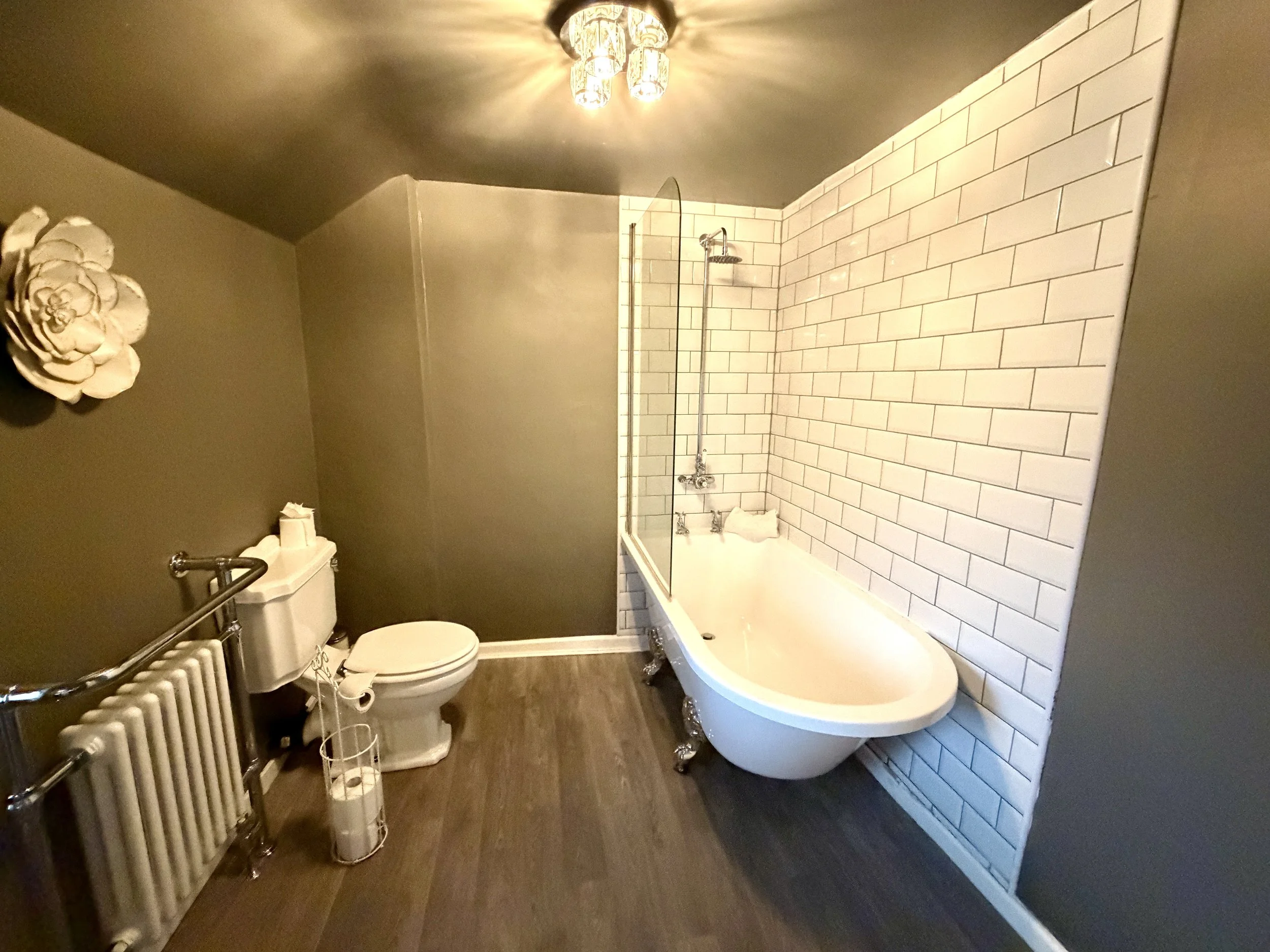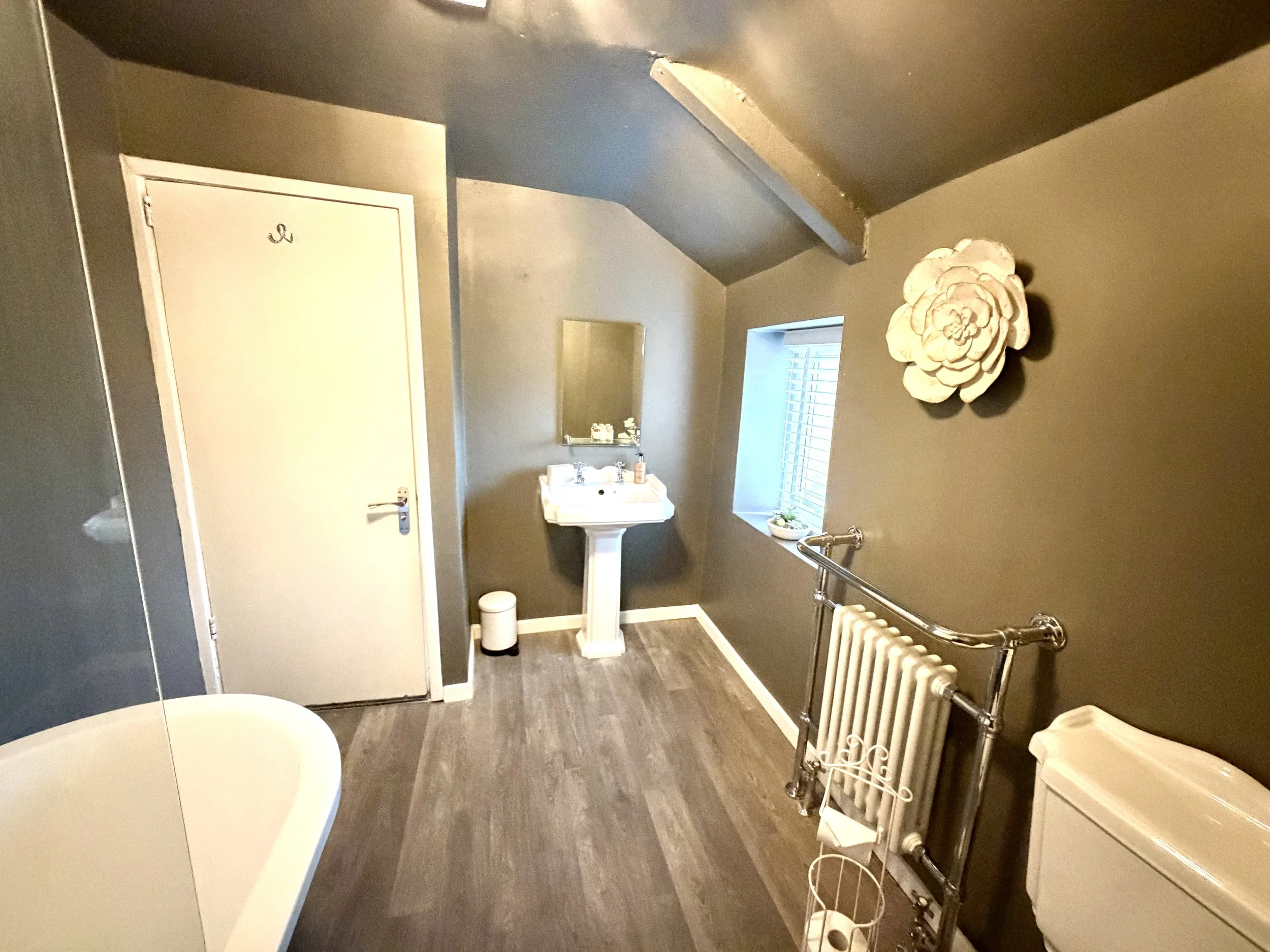 Main Bathroom: This beautifully designed traditional bathroom features a comfortable bath complete with an overhead mixer shower for your convenience. It also includes a modern toilet and a stylish basin, all complemented by a cozy heated towel rail that ensures a warm and inviting atmosphere.