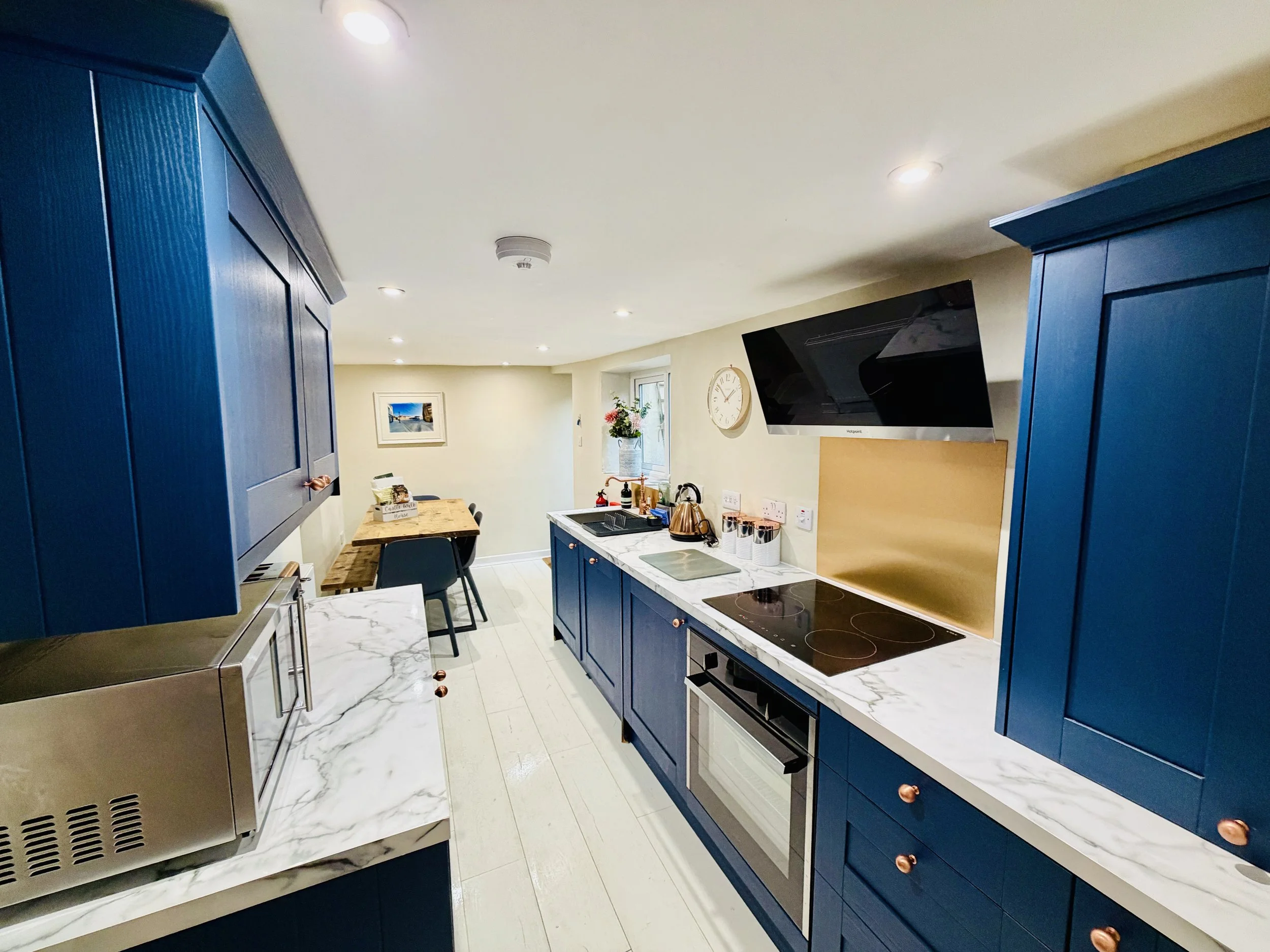 The kitchen is a true centerpiece, thoughtfully designed to meet all your culinary needs. It features modern appliances including a dishwasher, washer dryer, hob, oven, designer hood, under-counter fridge, and a separate under-counter freezer. The dining space is perfectly arranged with a table and chairs for six, ensuring a delightful setting for meals, and a highchair is also available for the little ones.