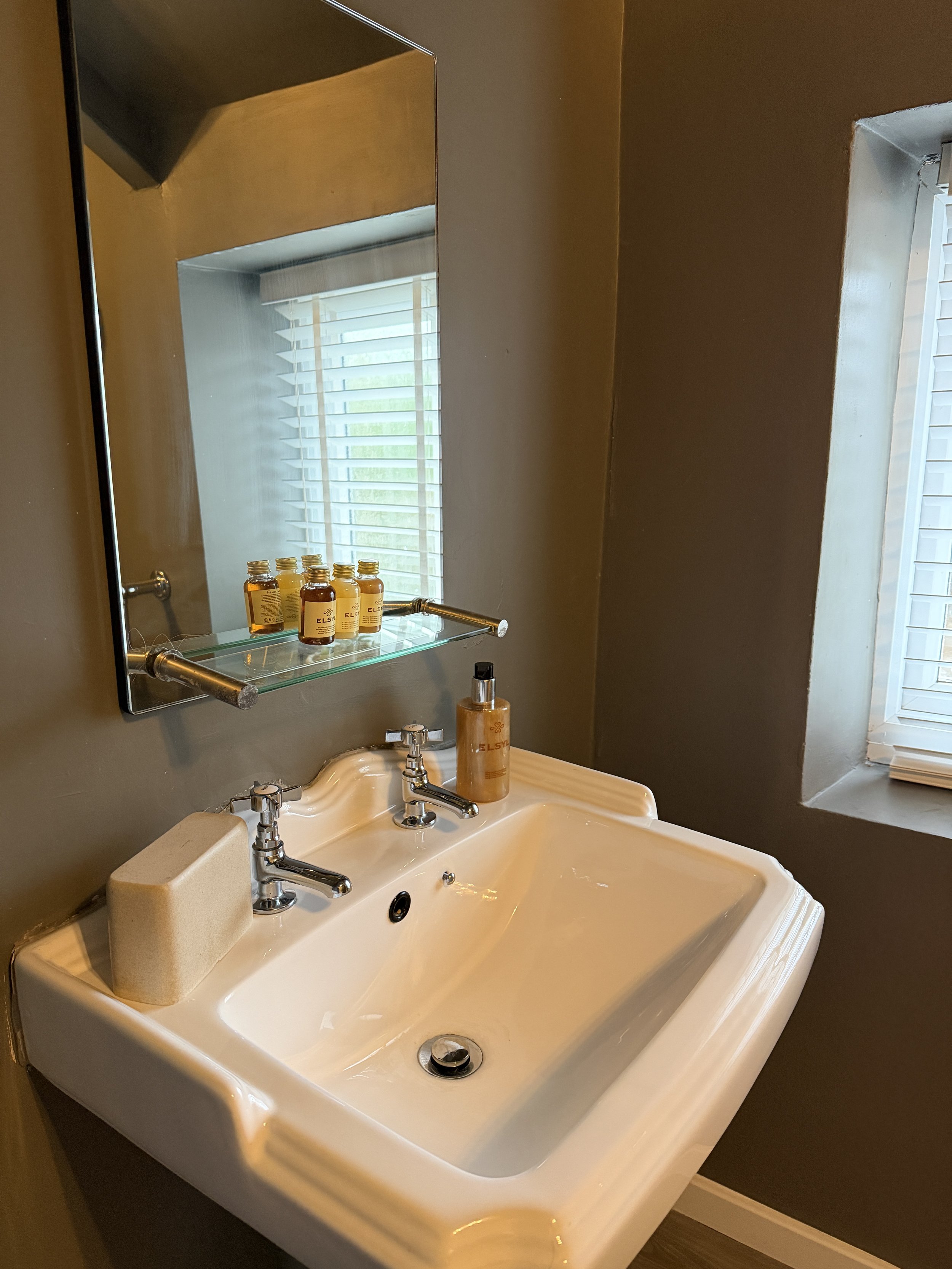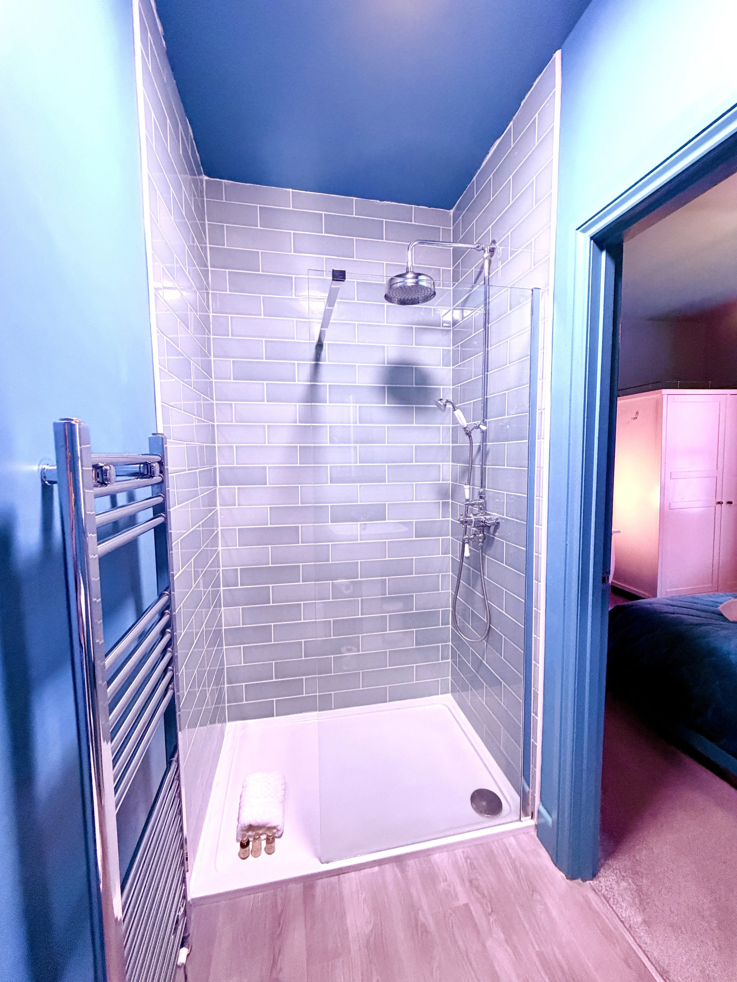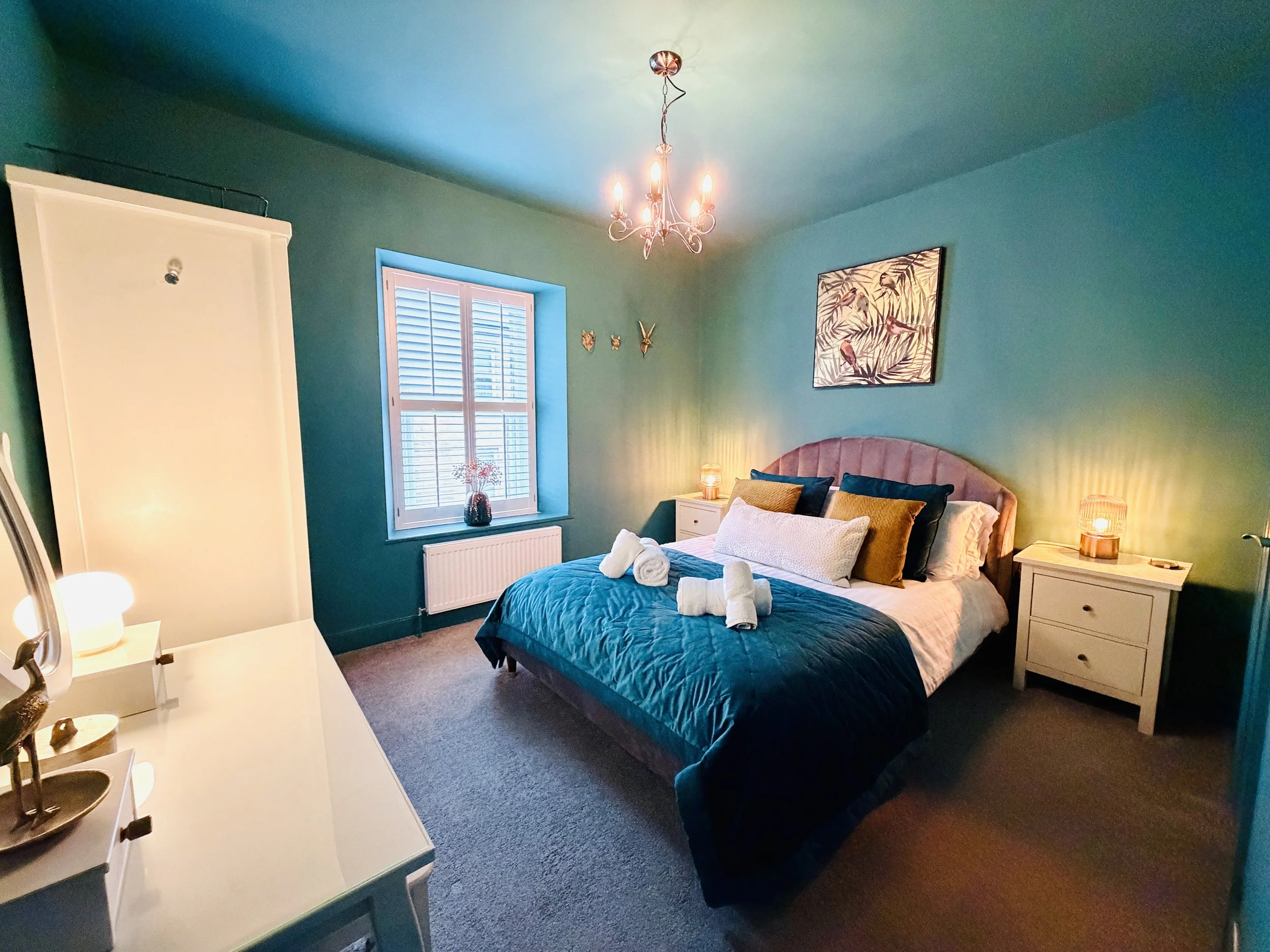 Room 1: Kingsize bed with a pocket sprung mattress, bedside lamps, dressing table with chair and mirror, and a double wardrobe. This room has an ensuite bathroom with a 1200mm walk-in shower, dual mixer, WC, basin, mirror, and heated towel rail.